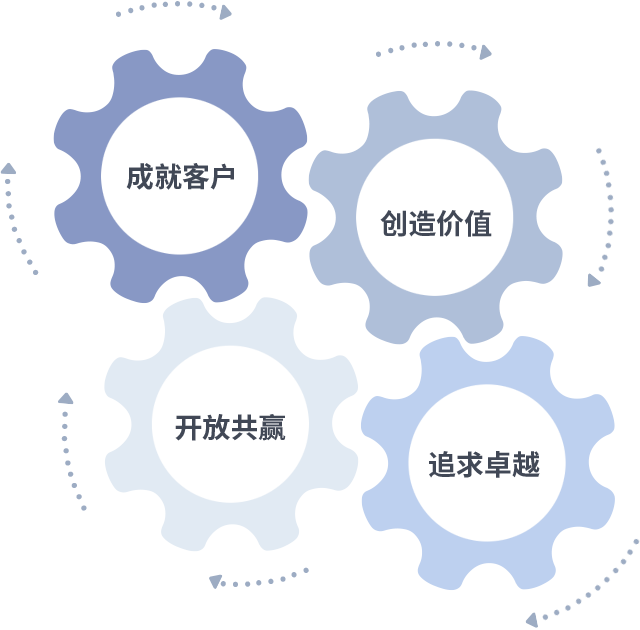 成就客户是一切决策的出发点,,,,创造价值是衡量所有工作的标准,,,,追求卓越是我们做事做人的态度,,,,开放共赢是我们的格局也是最终的结果。。价值观的齿轮环环相扣,,推动着组织里的每个人不断向前。。。